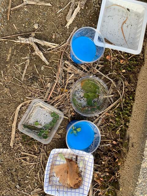 生活の時間に、子どもたちは事前に自由な入れ物に水を張り、それを学校菜園に置いて氷が張る様子を観察しました。水に色をつけたり、葉っぱを入れたりと、それぞれが工夫を凝らしてオリジナルの氷を作りました。