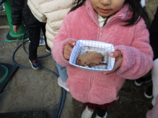 1時間目が始まると、子どもたちはすぐに学校菜園へ向かいました。そこには見事に氷が張っており、歓声を上げる子どもたちの姿が見られました。氷を容器から取り出して、その感触を確かめたり、みんなで見せ合ったりして楽しんでいました。冬ならではの楽しい実験を通して、水が寒さで氷になり、温かさで溶けていく様子を肌で感じることができました。