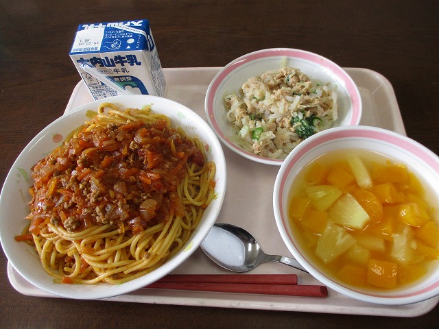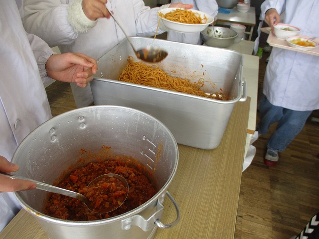 この日の献立は、スパゲッティミートソース、大根と水菜のサラダ、フルーツポンチでした。お昼の放送では、献立を考えた児童が、メニューの内容や献立作成のポイントについて説明しました。