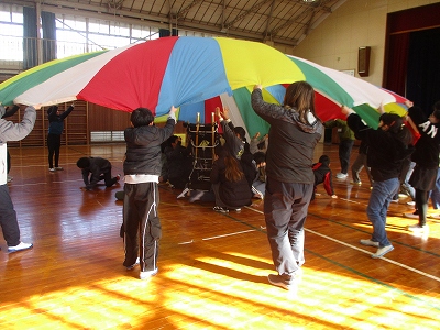 まず初めに、テントのような大きなシートを使ったバルーン遊びをしました。シートの下に、なごむさんや5年生数名が入り、周りの子どもたちがシートを上下に動かしながら回りました。
