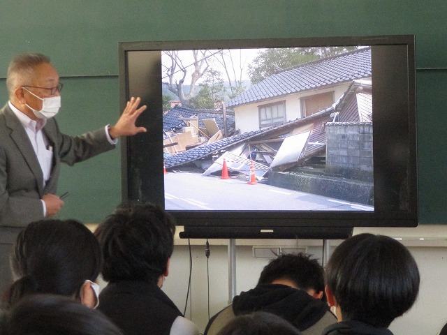 講義では、東日本大震災の映像や、家屋の1階部分が倒壊した画像、避難所の様子を写した写真などを視聴しました。その中で、家屋の倒壊により命を落とした方の多くは、大型家具の下敷きになったり、1階にいたため建物ごと押しつぶされたりしたことがわかりました。森本さんからは、「地震から命を守るためにも、寝室は2階に設けるほうがよい」とのアドバイスをいただきました。