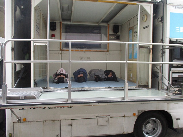 最初に、体育館で身を守るための「ダンゴムシのポーズ」を練習し、その後、4人1組で地震体験車「まもるくん」に乗り込みました。