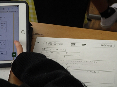 近年では、タブレット端末を活用したCBT(Computer Based Testing)システムを導入し、記述問題と併用して実施しています。このシステムにより、児童はテスト終了後すぐに正誤を確認できるだけでなく、正誤に応じた課題に取り組むことで、学習意欲の向上や学習内容の定着を図っています。また、教員はテスト終了後すぐに学年や児童ごとの強み・弱み、経年比較、つまずきのある問題などを把握することができ、それを基に個々の児童に応じたきめ細かな指導や授業改善を行っています。