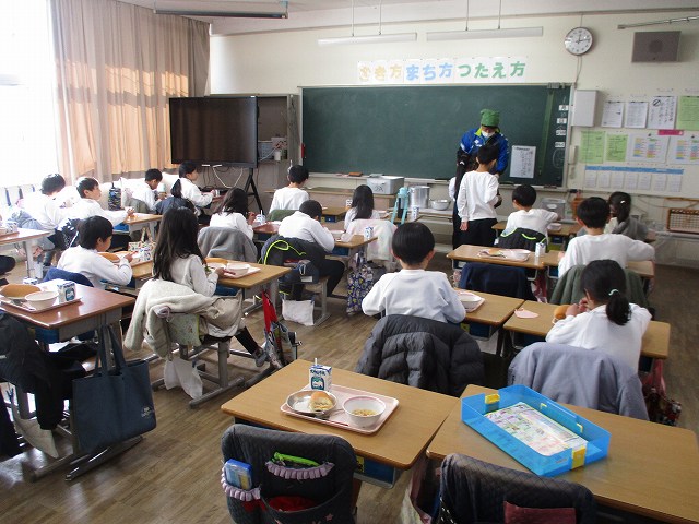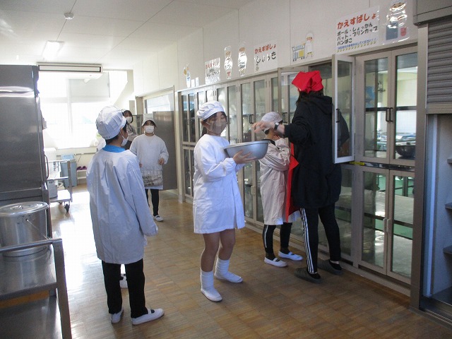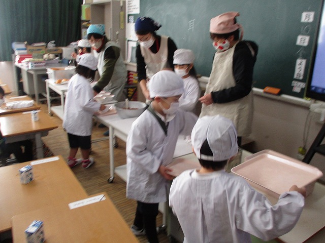 3学期ともなると、1年生も自分たちで配膳ができるようになり、成長を感じます。どのクラスも給食を取りに行く際は整然と並び、受け渡しもスムーズです。