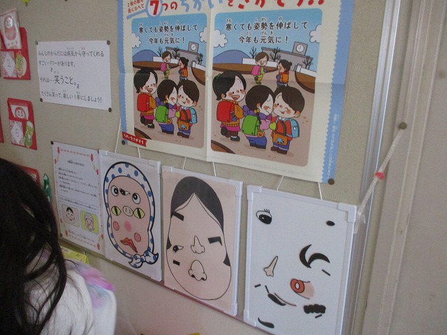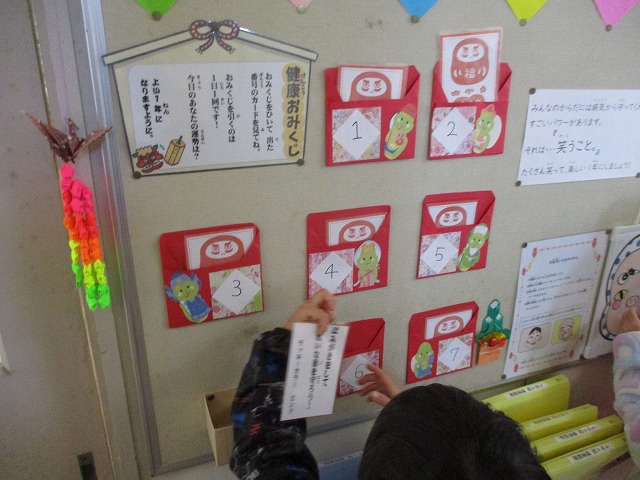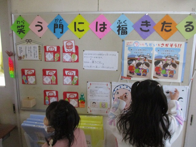 新年を迎え、保健室前に「笑う門には福きたる」をテーマにした楽しい掲示物が作られました。