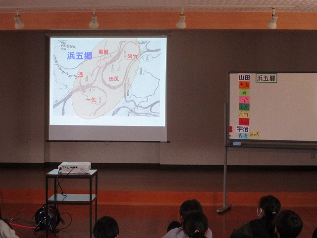 授業では、教育集会所の指導員の方から、宇治山田市(現在の伊勢市の一部)の概要や浜五郷の位置関係についてのお話を聞きました。また、浜郷地区の産業や文化についても学びました。