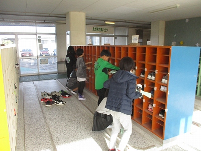 まずは、机や椅子の足についているごみやほこりを取り除いたり、扇風機の部品を洗ったり、ロッカーの中身を出して拭き掃除をしたり、下駄箱の掃除をしたりと、特別な作業から始めました。