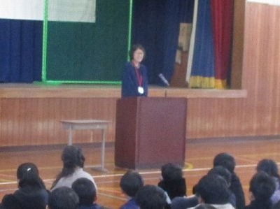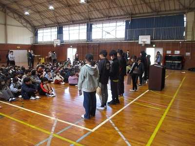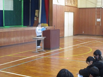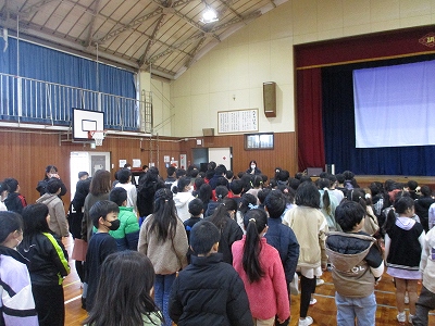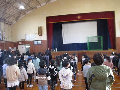 式の最初は、6年生の伴奏に合わせて、全員で校歌を元気よく斉唱しました。寒い日でしたが、力強い歌声が体育館いっぱいに響き渡りました。