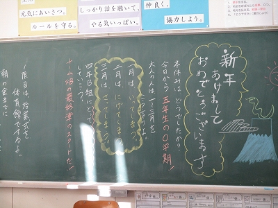 ◎始業式を終えた後、教室では担任の先生がそれぞれ新年最初の学活を行いました。黒板には、新年のあいさつやメッセージが、イラストも交えて書かれており、教室全体が温かい雰囲気に包まれていました。子どもたちは冬休みの思い出を楽しそうに話したり、3学期の目標をワークシートに書いたりしながら、新しい学期のスタートに期待を膨らませていました。