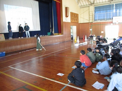 この日は、5年生が考えて準備した様々なゲームや寸劇、マジックを、なごむさんと一緒に楽しみました。