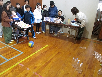 ゲームコーナーでは、的当てボール投げ、バスケットシュート、ボウリング、顔出しボード、輪投げ、浜郷クイズ、曲当てクイズ、タブレットゲーム、サイコロゲームなど、工夫を凝らした手作りのゲームが数多く用意されました。なごむさんも子どもたちに案内されながら、さまざまなゲームに挑戦し、楽しい時間を過ごしていました。