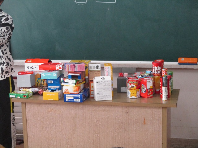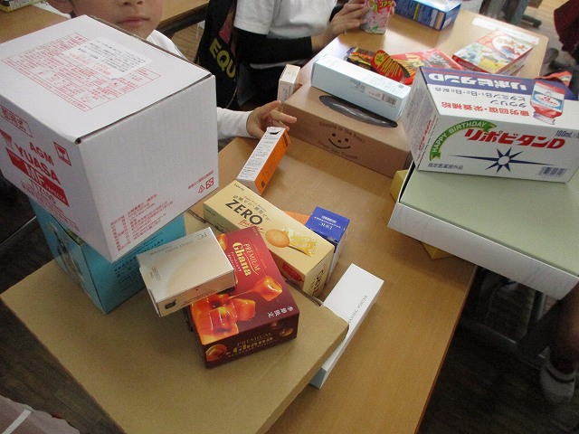 家庭からお菓子や雑貨の空き箱を持ち寄り、それを組み立てて、いろいろなものを作っています。直方体や円柱を中心に、五角柱や四角錐、または変形した直方体など、さまざまな形があります。子どもたちは想像力を生かして、どんな形を作り出せるか楽しみにしています。