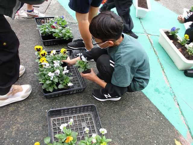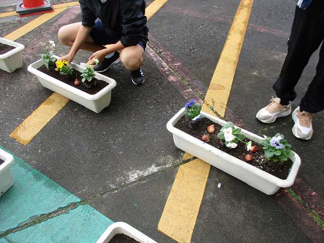 日本教育公務員弘済会三重支部より、令和6年度「花いっぱい活動支援事業」の一環として、チューリップの球根150球をいただきました。園芸委員会のメンバーが11月15日昼休みに中庭に集まり、プランターにパンジーの苗と一緒にチューリップの球根を植えました。春にチューリップの花が咲くのが楽しみですね。