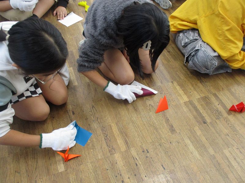 その後、障がいを持っているという想定で折り紙を折る体験をしました。具体的には、左腕が使えない設定で左手を使わず、右腕が麻痺している設定で右手に軍手をはめて折り紙を折ってみました。普段通り両手を使う場合と比べて、折り紙を折ることが非常に難しいと感じる体験となりました。