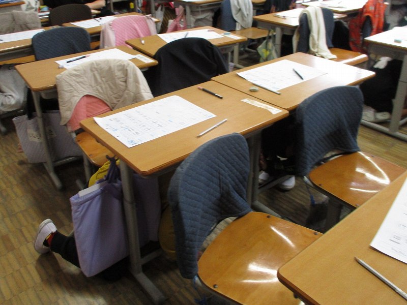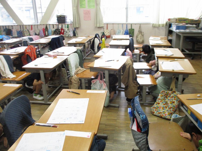 「震度6強の地震が発生します。20秒前...」という緊急地震速報がスピーカーから流れると、子どもたちはすぐに机の下に身を隠し、身を守る行動をとりました。皆、素早く対応できており、非常に良かったと思います。