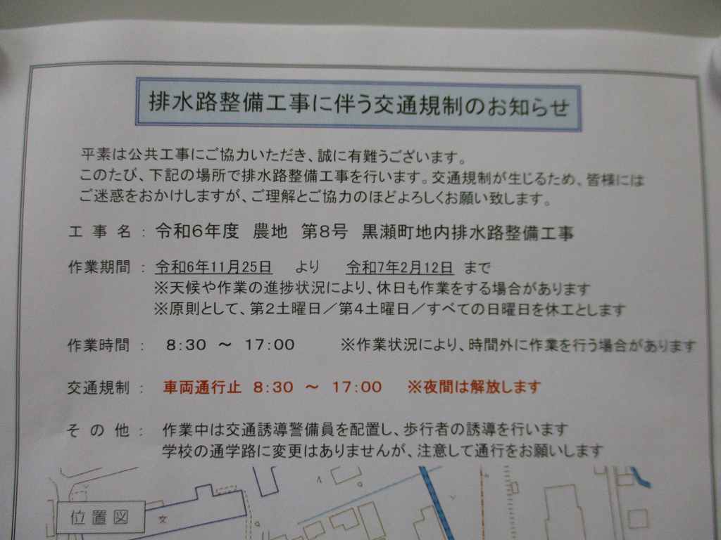 11月25日から、排水路整備工事に伴う交通規制があります。車両は迂回になりますが、通学路はそのままです。