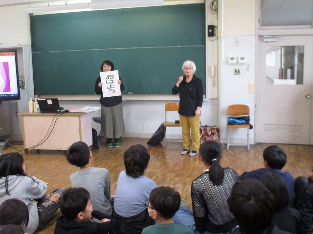 その後、簡単な手話を教わり、「おはよう」「好き」「元気」「ありがとう」などの表現を学んだ子どもたちは、すぐにその場で実際の会話に活かしていました。今日は、大変貴重な体験をすることができました。