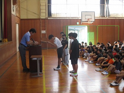 9日は、認証式と表彰を行いました。前期の児童会役員が、最後のあいさつをした後、後期の児童会役員、学級役員、委員長に認証状を渡しました。新児童会役員さんは、これからの抱負をしっかりと話してくれました。その後、科学創作展等の表彰を行いました。