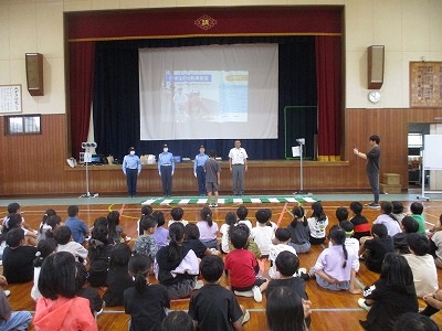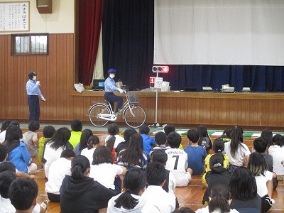 10日は、低学年と高学年に分けて交通安全教室を行いました。伊勢警察署の方が、実演やビデオで自転車の危険な場面など説明していただきました。自転車を乗るときは、ヘルメットをかぶって慎重に運転しましょうね。