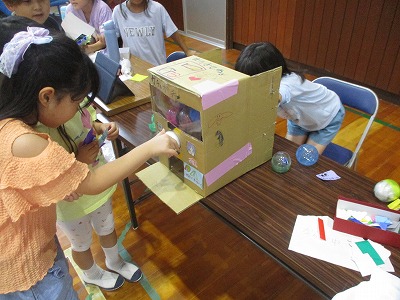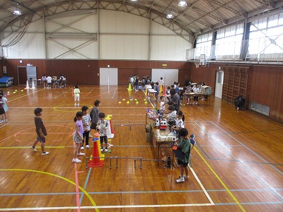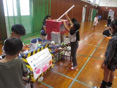 2限目2年生が体育館でおもちゃランドを開き、1年生を招待しました。手作りのおもちゃを体育館に並べ、おみせ屋さんのようにガチャガチャや的当てなど楽しいゲームを準備してくれました。1年生はすてきな景品をたくさんゲットしたようです。1年生も2年生も生き生きと楽しく過ごしていました。2年生のみなさん準備ご苦労様でした。