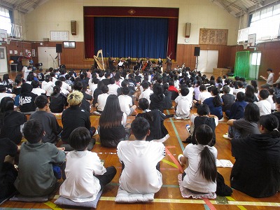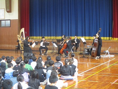 昼から「子どものためのクラシックコンサート」を体育館で行いました。前半は、東京アーティスツ合奏団のみなさんの素晴らしい演奏から始まり、色々な楽器の紹介など。本物の音楽を聴いたって感じです。後半は歌のおねえさんの素敵な歌声にみんな笑顔笑顔のコンサートでした。