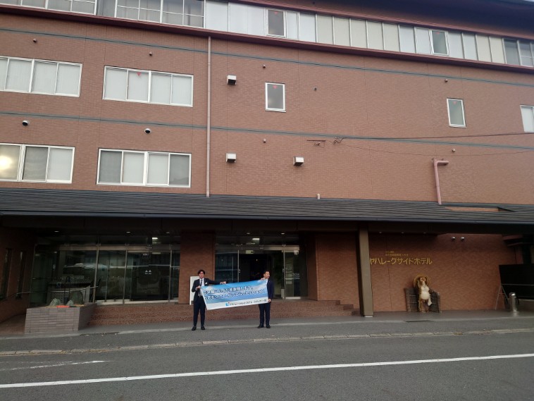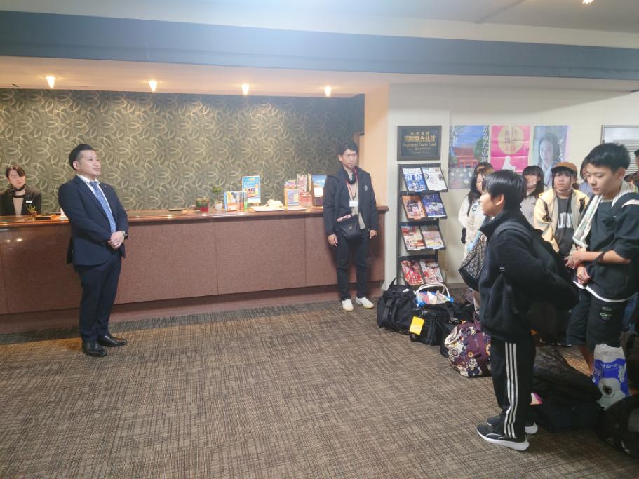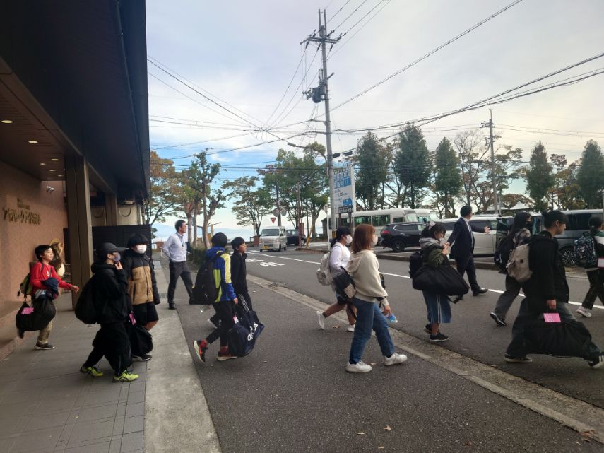 お世話になったホテルの方に、児童会代表からの挨拶があり、予定通り7時50分にホテルを出発しました。少し肌寒いですが、今日も晴天に恵まれました。ホテルの方が横断幕を持って見送ってくださいました。日本最大の湖、琵琶湖沿いを通りながら、ホテルを後にしました。これから京都に向かいます。