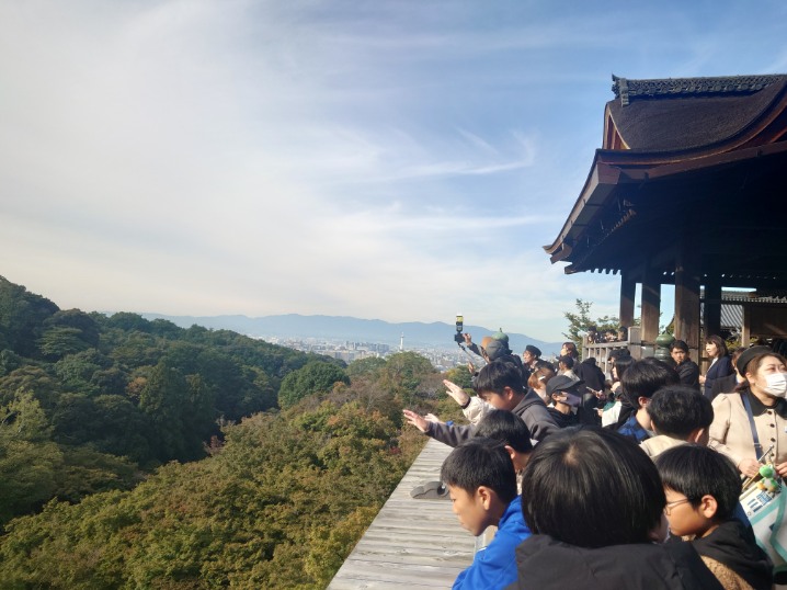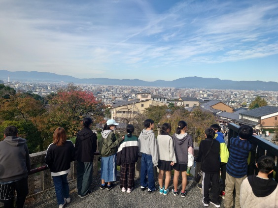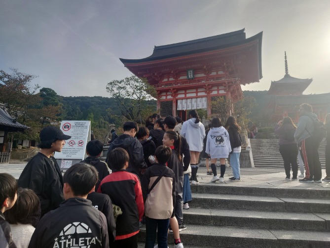 2日目、最初の見学地は清水寺です。8時半に駐車場に到着し、参道を登って向かいました。今日は混雑もなく、スムーズにお寺に着くことができました。現地ではまず記念撮影を行い、三重塔を見たり、街の景色を楽しんだりしました。ここは普段は混雑していてなかなか入れない場所ですが、今日は空いていてラッキーでした。