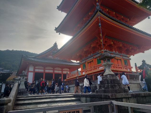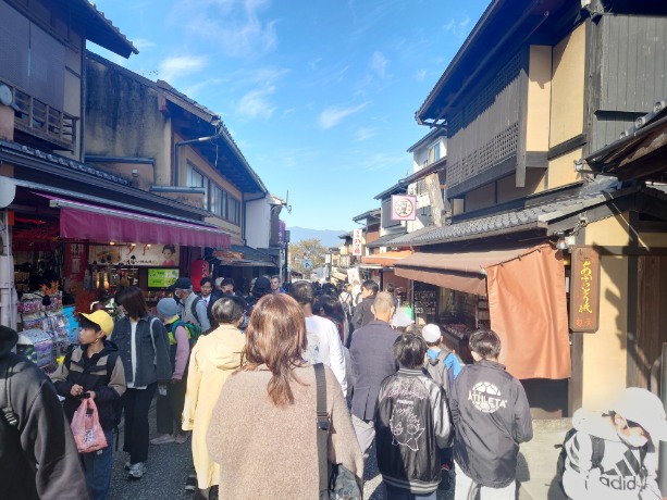 その後、「清水の舞台」として知られる清水寺の本堂を見学しました。次第に清水寺は観光客で混み始め、帰りの参道は人であふれていました。