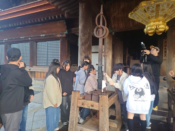 清水寺では、弁慶が使っていたとされる錫杖がありました。大きい方は重さが96kg、小さい方は17kgで、これを持ち上げるとご利益があるとされています。みんな大きい方に挑戦しましたが、びくともしませんでした。