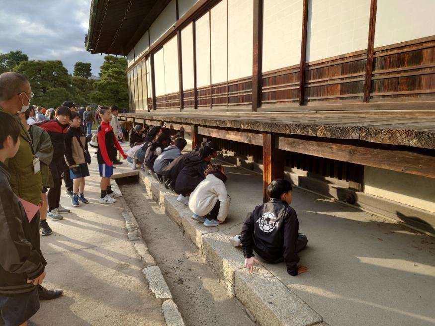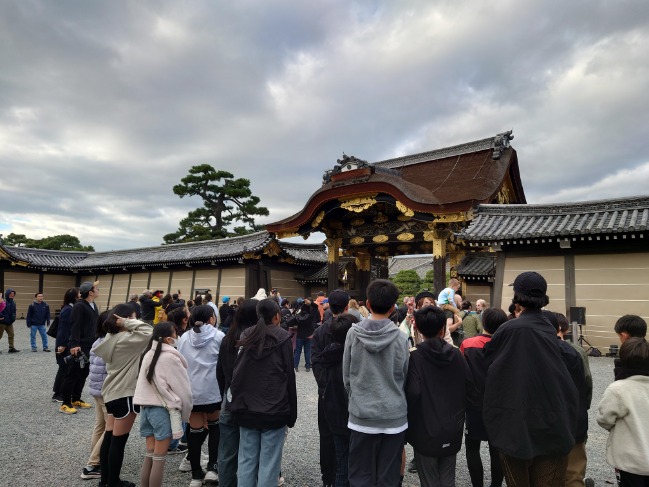 京都に移動して二条城を訪れました。大政奉還で有名な二の丸御殿に入り、歩くと音がする「鶯張り」の廊下を進みながら、障壁画や金の装飾など、豪華絢爛な造りを堪能しました。建物の外に出てからウグイスの鳴き声の仕組みをガイドさんに教えてもらい、きれいな庭園を見ながら二条城を後にしました。