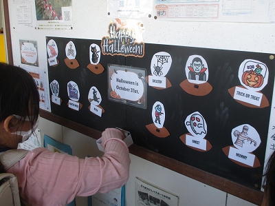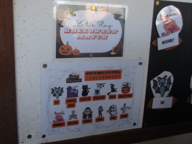 間もなくハロウィーンがやってきます。ALTの先生が廊下の掲示板に、ハロウィーンコーナーを作ってくれました。そこには「Trick or Treat」や「Haunted House」など、ハロウィーンに関するイラストが描かれており、それぞれの下に正しい単語を当てはめていくという掲示物です。すべての単語を正しく埋めることができたら、ALTの先生からシールがもらえます。みんな、楽しみながらハロウィーンの単語を覚えられますね。