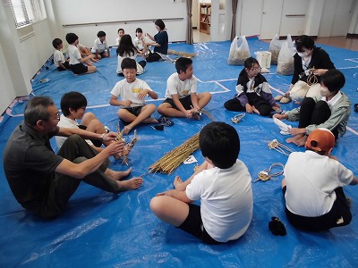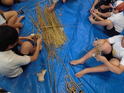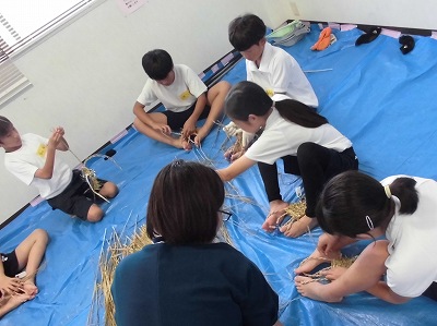 10月18日、5年生の「はま☆スタ」でわら草履作りを行いました。教育集会所の皆さんのご指導のもと、先日叩いて柔らかくしたわらを一本一本丁寧に編み込んでいきました。1時間半ほどで、みんなそれぞれ個性的なオリジナルのわら草履が完成しました。このわら草履は、作品展(学校公開日)で体育館に展示し、一般公開します。