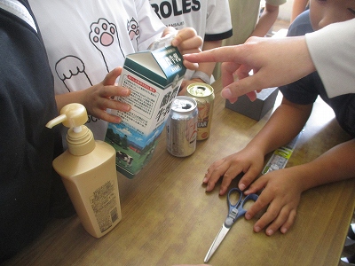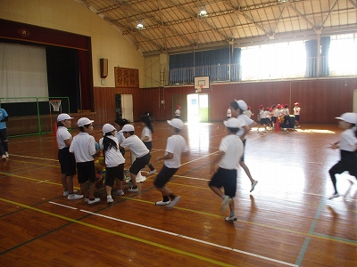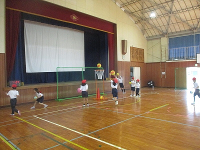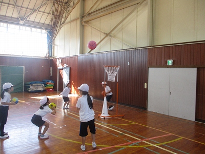 2年生は体育の時間にボールゲームをしました。「セストボール」というバスケットボールに似た競技で使うゴールポストを利用し、担任の先生が考案したオリジナルゲームを楽しみました。その名も「ポイポイランド」です。