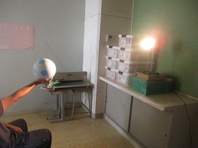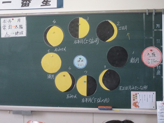 6年生は理科の授業で月の満ち欠けについて学んでいます。太陽の位置に応じて月がどのように変化するかを、実験を通じて確かめました。個別に用意されたライトとボールを使い、児童はボールを手に持ち、椅子に座って自分で回転しながら、月の見え方の変化を確認していきました。ライトに向かってボールを持つと「新月」、ライトに背を向けると「満月」、ライトが真横にあるときは「半月」となります。普段何気なく見ている月の満ち欠けの仕組みを、こうした実験を通じて体験的に学ぶことができました。