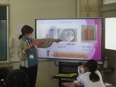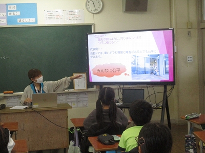 10月23日、4年生は社会福祉協議会の職員を講師に福祉体験授業を行いました。1時間は教室でユニバーサルデザインについて学び、もう1時間は体育館で車いすの体験をしました。