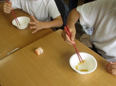 授業では箸の正しい持ち方の説明を聞いたあと、実際に箸を持ってスポンジやパスタを挟む練習をしました。上手な子どももいましたが、きちんとできない子どもがたくさんいました。箸の持ち方はおとなになってからではなかなか直りませんので、子どものときにしっかりと身に付けておきたいですね。