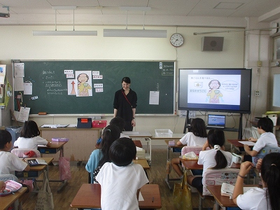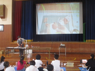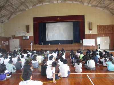 低学年と高学年がそれぞれ1時間ずつ体育館で授業を受けました。