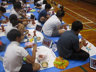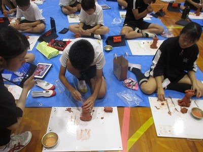 体育館に敷いたブルーシートの上で、まずは粘土をこねて空瓶にかぶせ、胴体を作ります。さらに頭や脚をくっつけて基本的な土台が完成します。仕上げに顔や体のパーツを思い思いに取り付けていきます。長船さんのアドバイスをいただきながら、自分だけのオリジナルシーサーができあがりました。