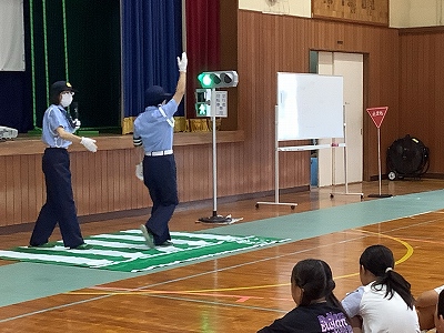低学年については、さらに安全な歩行の仕方について、実演をしながら説明をしてくれました。歩行者用信号が青でも、きちんと右・左・右を見てから渡りましょう。