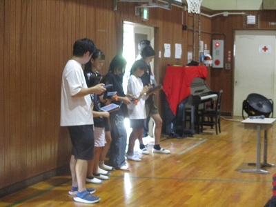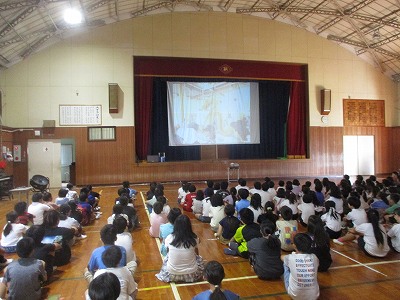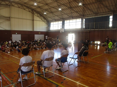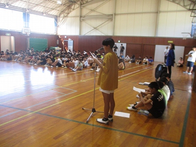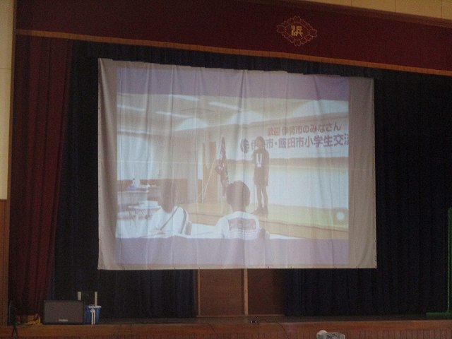 児童集会の中で、8月8日〜9日に開催された「伊勢市・飯田市小学生交流会」の報告会がありました。本校からは児童会役員4名と、児童会顧問の先生が参加しました。飯田市では児童会交流、水引体験、そらさんぽ散策、アップルパイ作り体験をしました。中央の写真は歓迎式で本校の児童会会長があいさつをしているところです。4人の児童会役員は伊勢市の代表としてその役目を立派に果たしてきてくれました。