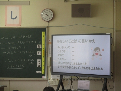 授業では、ことばが人を楽しませたり悲しませたり、時に傷つけることもあるということを学びました。「うれしいことば」や「かなしいことば」の例を挙げ、言われたときの気持ちを確認しました。また、悲しいことばを言い換えることで、嫌な気持ちにさせずに済むことも教えていただきました。