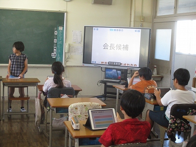教室にもどってからは、選挙管理委員の指示と担任の先生の立会のもと、投票を行いました。今回は初めての試みで、タブレットを使った「電子投票」を行いました。特に混乱もなく、スムーズに投票ができました。