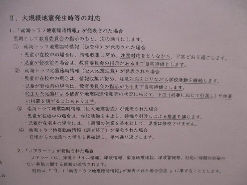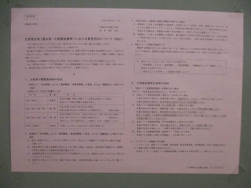 災害発生時(風水害・大規模地震等)における緊急対応についてを改訂し、9月11日に保護者宛てに配付しました。