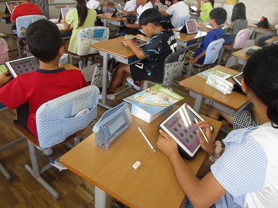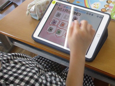 この日は、色の英語をビンゴゲームを通して復習をしました。ビンゴは紙のプリントではなく、タブレットを使用して行っています。red, blue, whiteなどの絵の具のイラストのリストの中から、9枚をランダムに選びビンゴの枠にドラッグしていきます。ALTや専科の先生がI like red. Kocho-sensei likes blueなどと言って、その色の英語を聴き取って、該当するイラストに〇をつけます。数種類の色の英語を発音したと、何本のビンゴができたかを競います。子どもたちは、集中して聴き取り、素早く〇をつけることができました。とても楽しそうに活動をしていました。