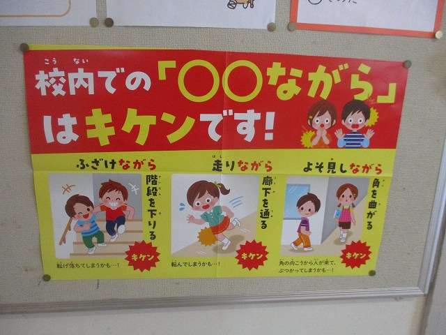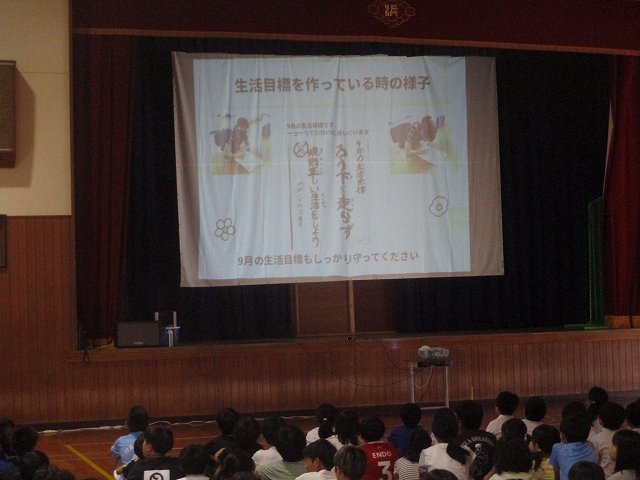 次に、児童会役員から、9月の生活目標についての話をしてもらいました。9月の目標は「廊下を走らない」です。このように、自分たちでルールを守ることを意識し、その効果もあって、廊下を走る人が激減しました。