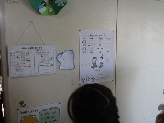 9月5日、6日は2学期始めの身体測定が行われました。クラスごと男女別に保健室に集合し、身長と体重を測りました。みんな保健室前や中では静かに順番を待つことができていてよかったです。身長は1学期よりやや伸びていたみたいで、体重はこの夏休みで増えた人と、減った人様々でした。