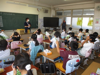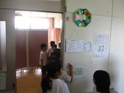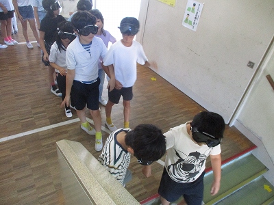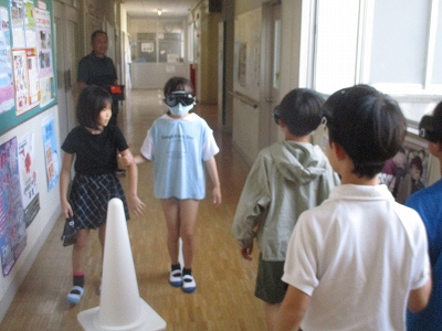 アイマスクをつけるとまったく目が見えなくなります。アイマスクをつける児童と、サポート役の児童がペアを組んで、廊下や階段を歩いてみました。アイマスクを付けた児童は、「全然見えなくて怖かった」「まっすぐ歩けなかった」「階段を降りるとき難しかった」などの感想を、また、サポート役の児童は、「コーンや階段を案内するのが遅れてしまった」「思っていたよりもやってみると難しかった」「サポートするほうもたいへんなことがわかった」などと感想を言っていました。今日はとても貴重な体験ができました。