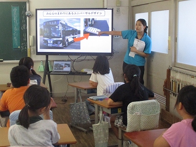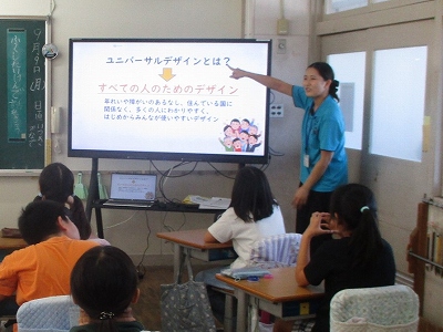 ユニバーサルデザインとは「すべての人のためのデザイン」で年齢、障がいのあるなしに関係なく、多くの人にわかりやすく、使いやすいデザインです。ノンステップバスや自動販売機、シャンプーのギザギザなど、身の回りにあるユニバーサルデザインをスライドで紹介してもらいました。また、ルービックキューブやオセロゲームなど目の見えない人でも遊べる工夫をされたデザインを実際に触ってみました。みんなが暮らしやすい町にするために、環境を整えることと、「心のユニバーサルデザイン」を身に着けることの大切さを学びました。