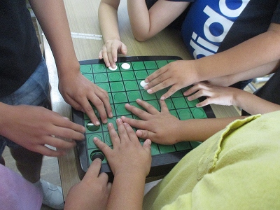 タブレットクラブでは「クアルト」というゲームをしていました。四目並べの要領で、コマが縦・横・斜めに1列揃えた方が勝ちというとてもシンプルな2人用ゲームです。とても奥が深く思考力が鍛えられます。