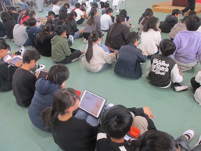 3月9日、令和8年度前期児童会役員選挙が行われました。選挙権のある3〜5年生が体育館に集まり、立会演説会と投票が行われました。12名の立候補者が会長・副会長・書記の順に公約などを述べましたが、どの候補者も自分の意見をしっかりと伝ていました。投票は、体育館でタブレットを使った「電子投票」を行いました。